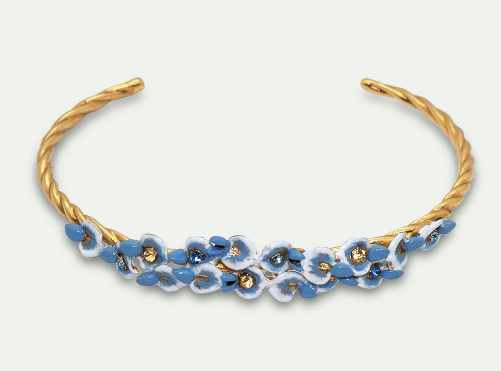Cuff bracelet, paved with wisteria flowers and blue and yellow crystals. Gold-plated twisted setting.