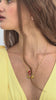 Gold-plated brass Little Red Riding Hood necklace, composed of a little girl wearing a red hood sitting on a bed of golden flowers and holding a little grey duck in her arms, hand-painted.